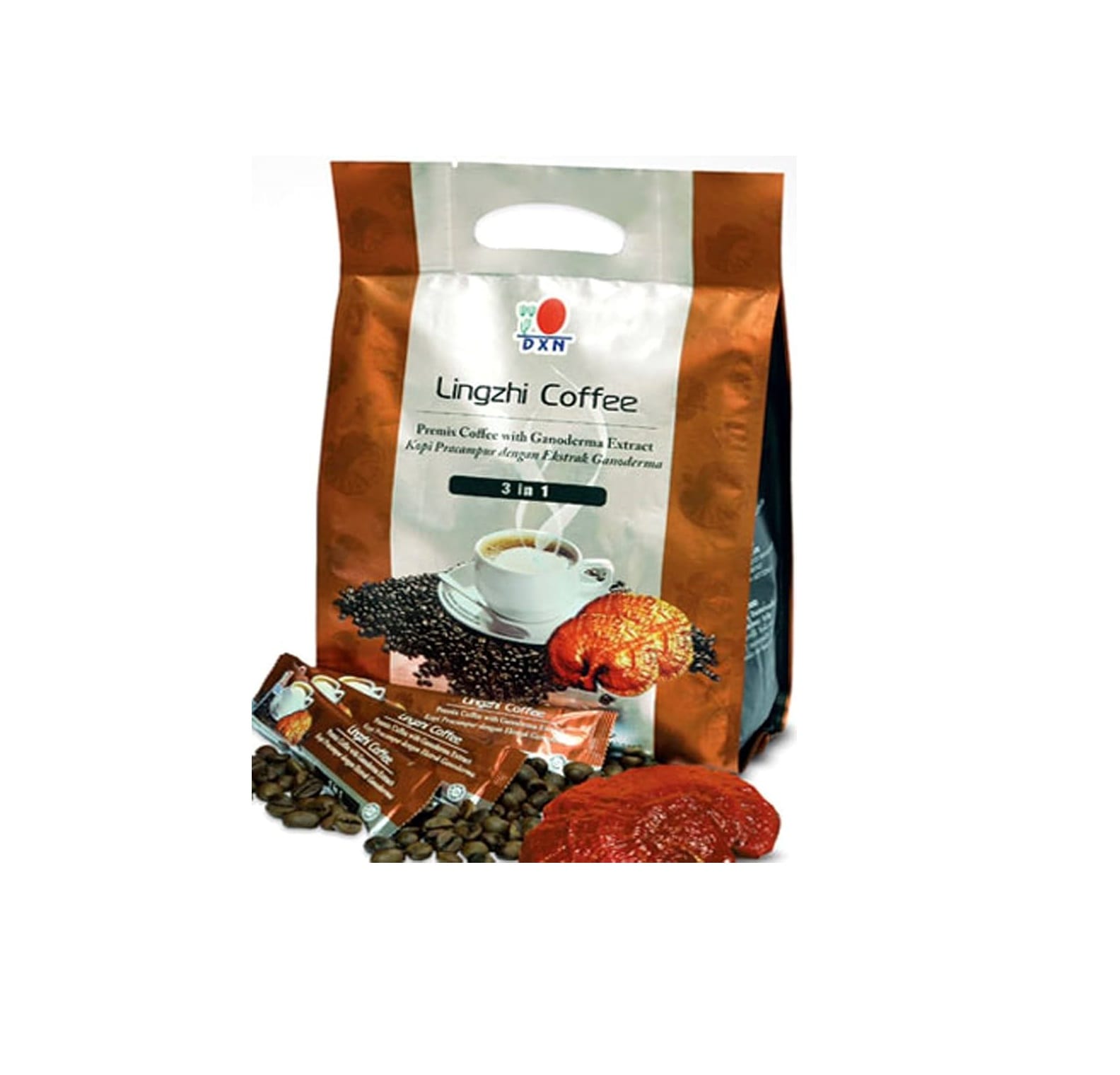 El DXN Lingzhi 3 en 1 Café 20 sobres es una deliciosa combinación de café de calidad, crema no láctea y azúcar, enriquecida con extracto de Ganoderma lucidum, un hongo reconocido por sus beneficios antioxidantes y energizantes.